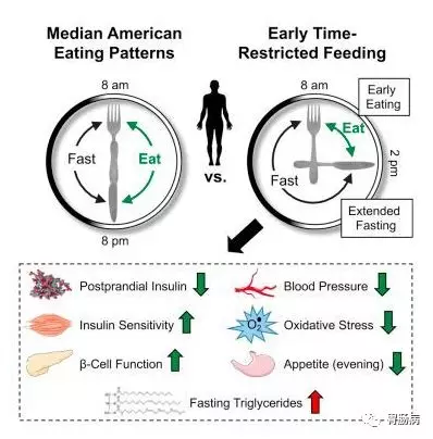 试验结果显示,将每天三餐的进食时间限制在 6 个小时内,下午 3 点后就禁食,在不减食量的状况下,可以带来胰岛素敏感性上升、降低血压,限制食欲等多重改善,这些效果并不是饿出来的。